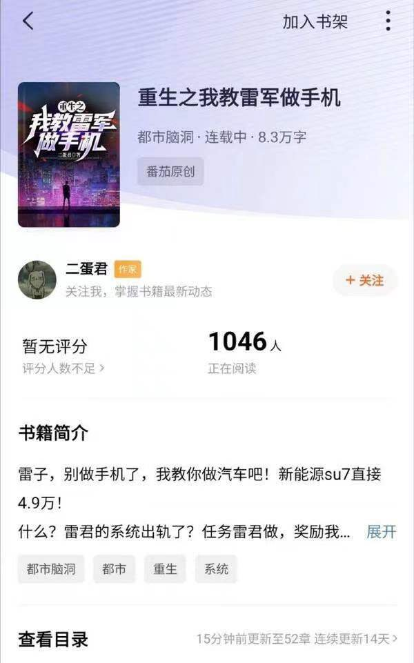 这本小说不仅吸引了小米的粉丝,也吸引了很多对科技和手机感兴趣的读者,很快就在网上引起了广泛的关注和讨论。目前,这本书已经连载至52章,连续更新了14天,截图时,有超过1千人正在阅读该文。