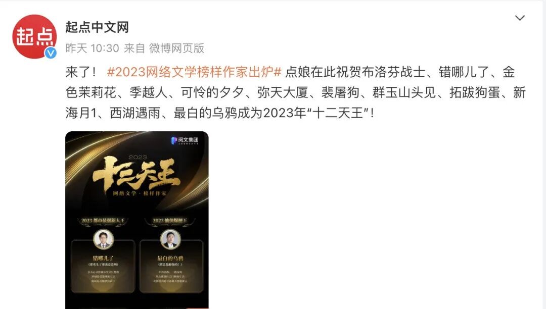 1月10日,2023年网络文学榜样作家“十二天王”出炉。据悉,“十二天王”是网络文学行业榜单,旨在评选网文行业年度新秀,刚刚杀青的影视剧《大奉打更人》作者卖报小郎君,就曾跻身“十二天王”之列。