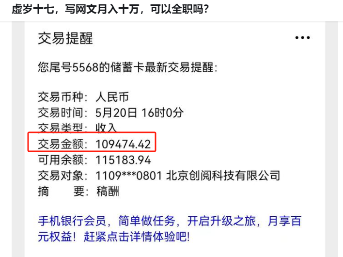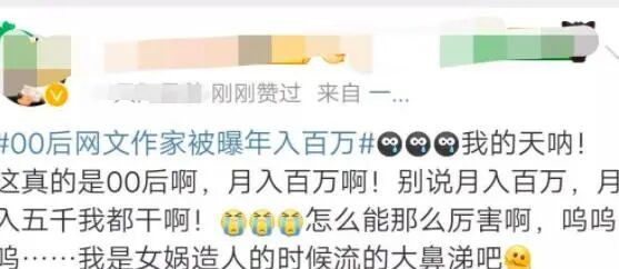 而在其他社交平台上,甚至还有未成年网文写手提问:“虚岁十七,写网文月入十万,可以全职吗?”(是哪个成年的大人流下了羡慕的泪水?!)