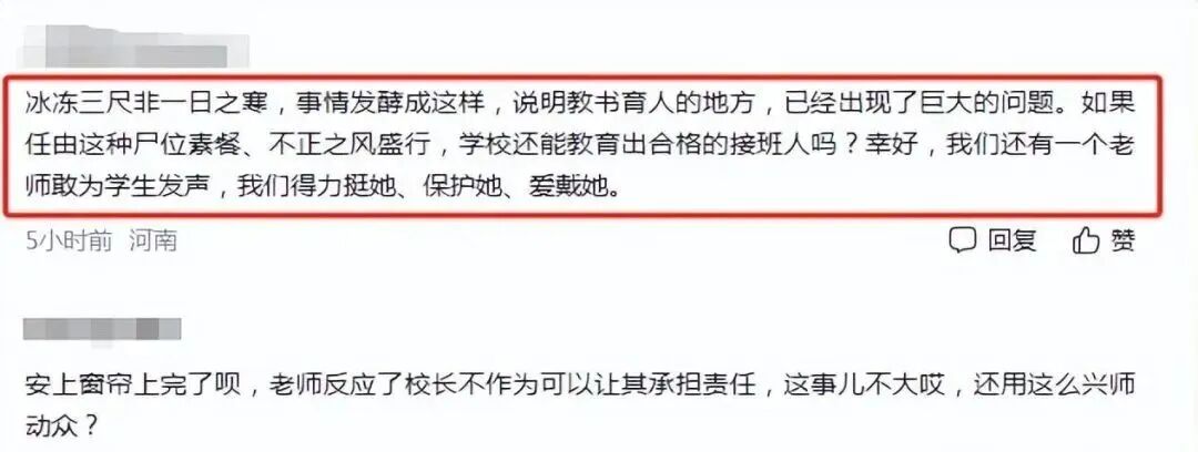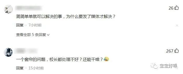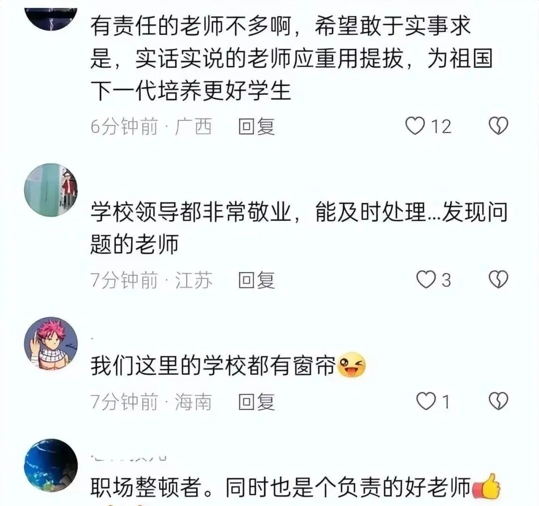 不止如此,陈老师在学校的日常工作和生活,也处处受到了领导的“排挤”。网友们十分疑惑,说到底,安窗帘就是一件小事儿。校方有责任、有义务为学生解决问题。明知学生受到了影响,为什么校方领导推三阻四,就是不给学生解决问题。反过来,还要将矛头对准反映问题的陈老师?