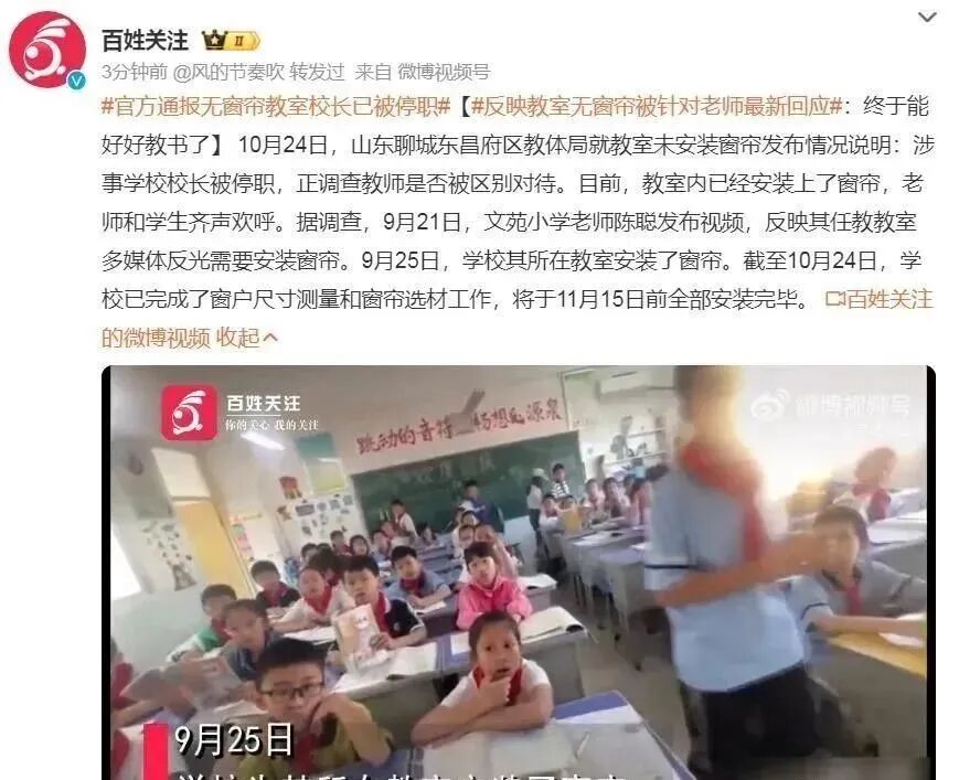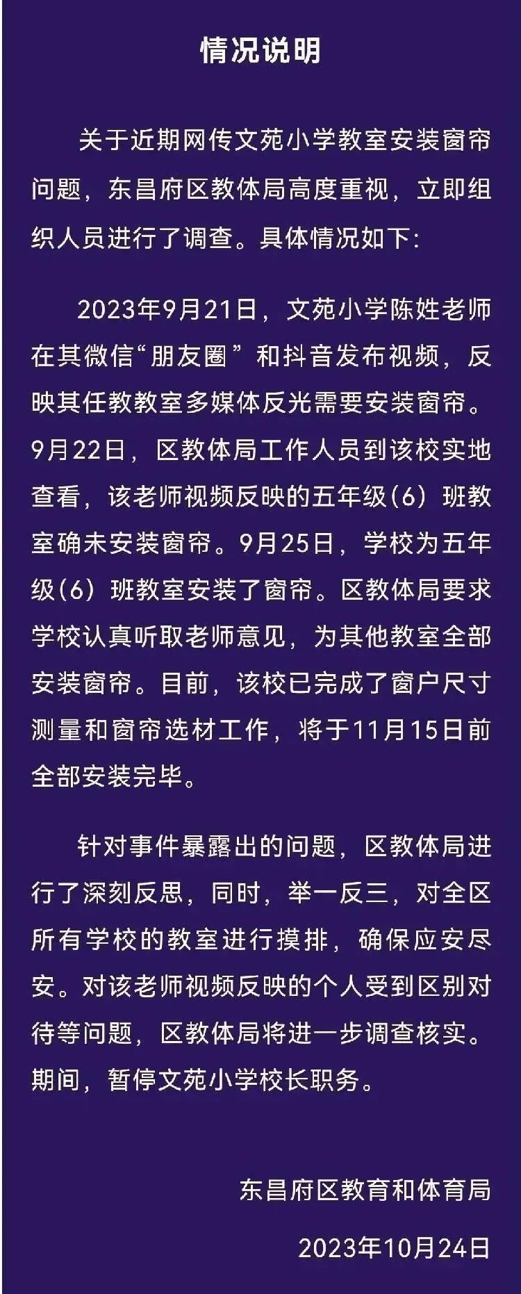 核实情况后,相关部门立马责令学校安装窗帘。并且要求其在11月15日前,为所有教室全部安装上窗帘。针对陈老师在学校受到区别对待一事,相关部门正在进行调查和核实。目前,该小学的校长暂停职务,等待调查。