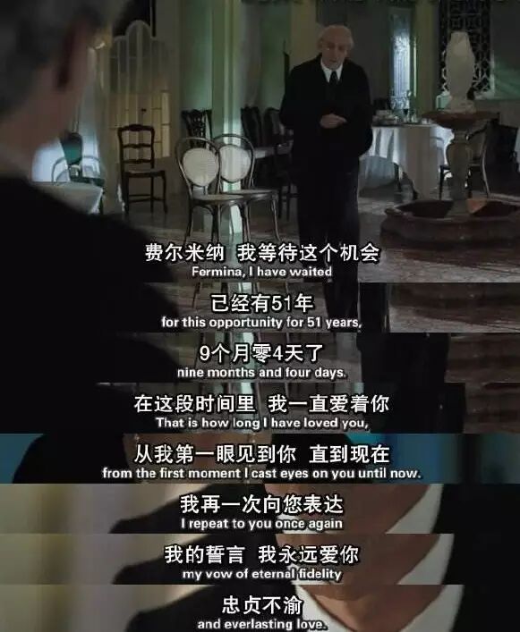 ▌费尔米纳,我等待这个机会,已经有51年9个月零4天了,在这段时间了,我一直爱着你,从我第一眼见到你,直到现在,我第一次向你表达我的誓言,我永远爱你,忠贞不渝。