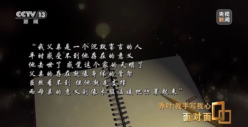 1993年2月,中国青年报副刊发表了乔叶的散文处女作《别同情我》,父亲身患癌症去世的那一年,乔叶才15岁,六年后,她用这篇文章怀念父亲,文中她写道:“我父亲是一个沉默寡言的人平时感受不到他存在的意义,他去世了,感觉这个家的天塌了。父亲的存在就像身体的骨架,虽然看不到,但他就是支撑。而母亲的意义则像衣服,温暖把你裹起来”。