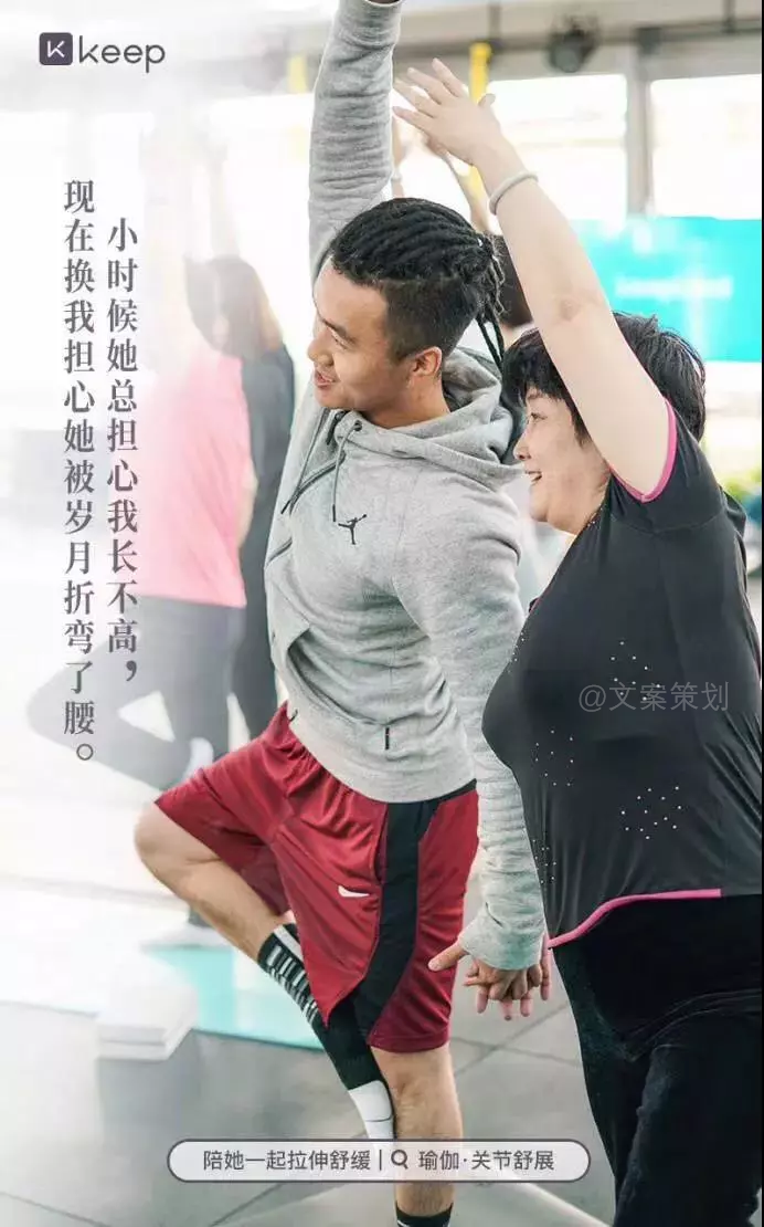 文案通过小时候妈妈总是担心我们长不高,现在换做我们有了相同的情绪,担心劳累的妈妈累弯了腰,从而带出Keep的品牌。