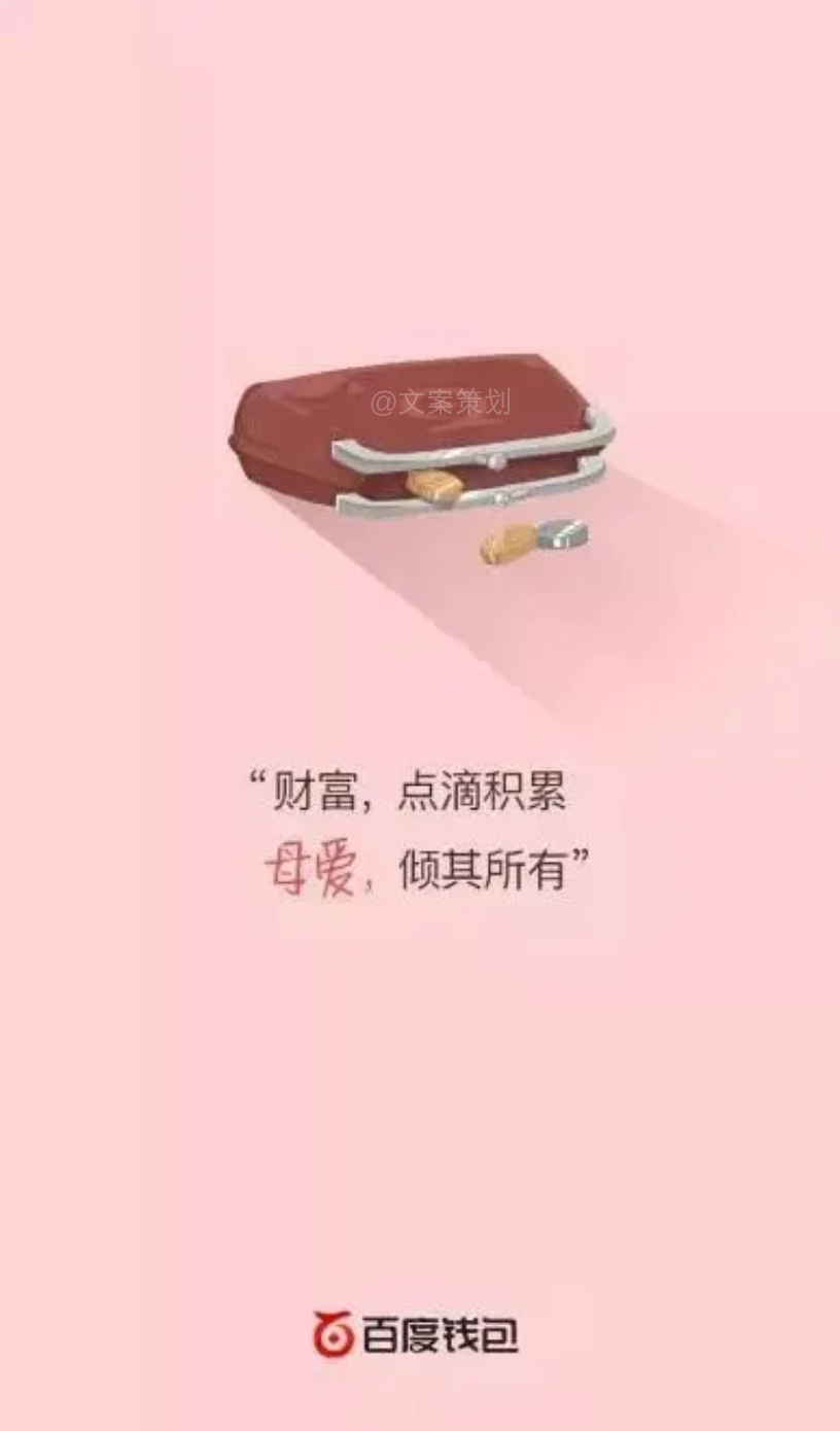 文案通过类比,形象且又深刻的传达出财富是需要慢慢积累的,而母爱则是倾其所有,非常贴合母亲节的一句借势文案。