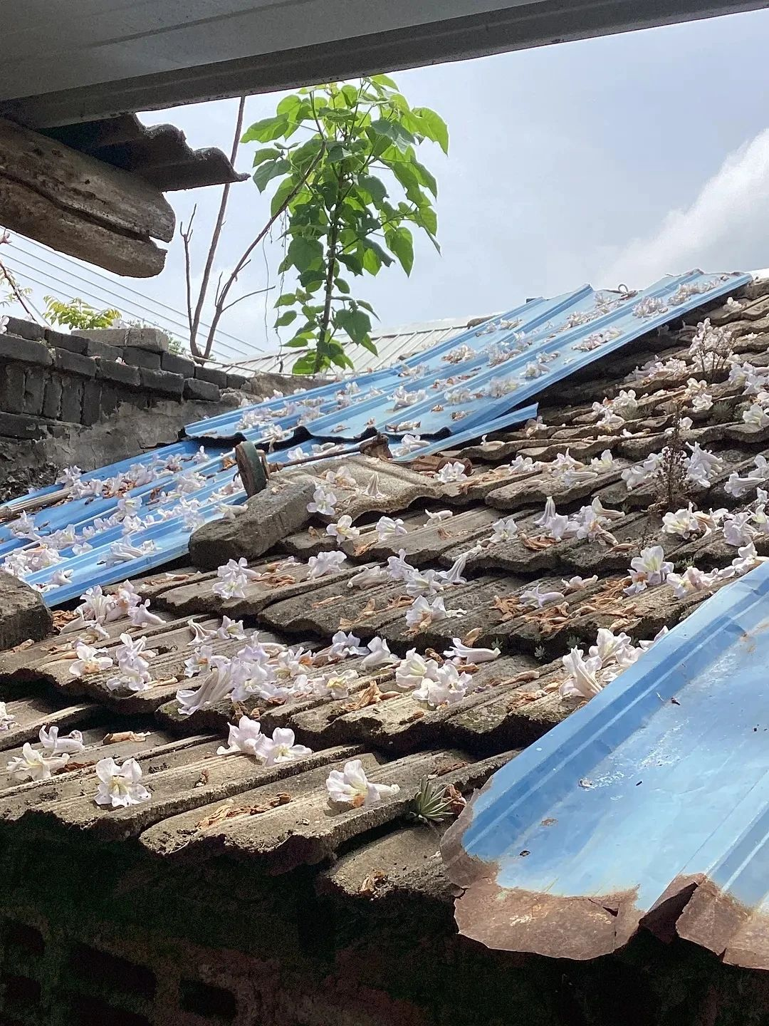 ——老房子的屋顶,落英缤纷,像是荒凉里开出了花,时光不老,花愈浓。