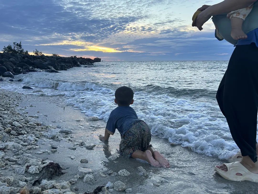 怎么形容这个画面,在海边的小孩与余晖对视?