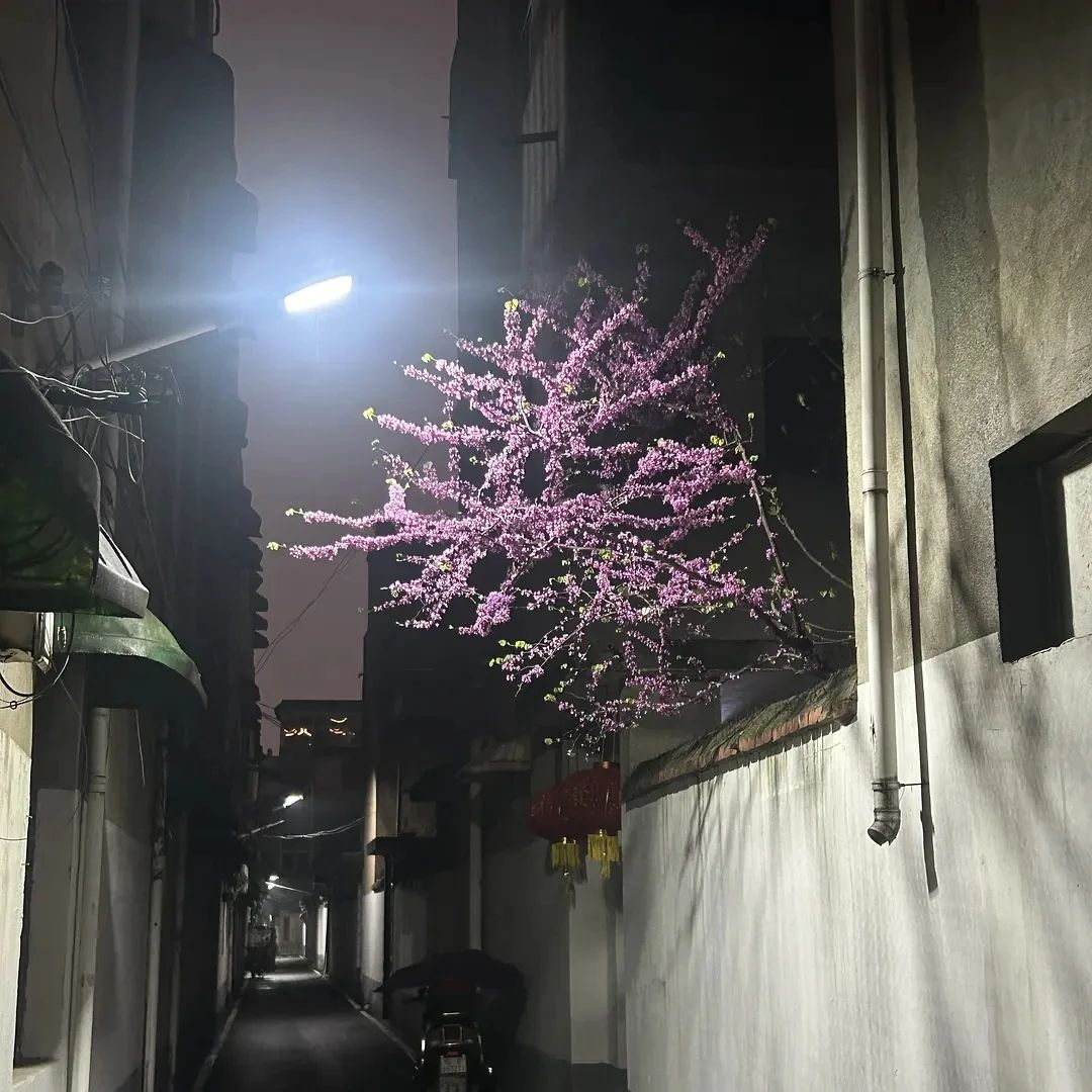 如何形容花从院墙里伸出来,路灯恰好照在花上?