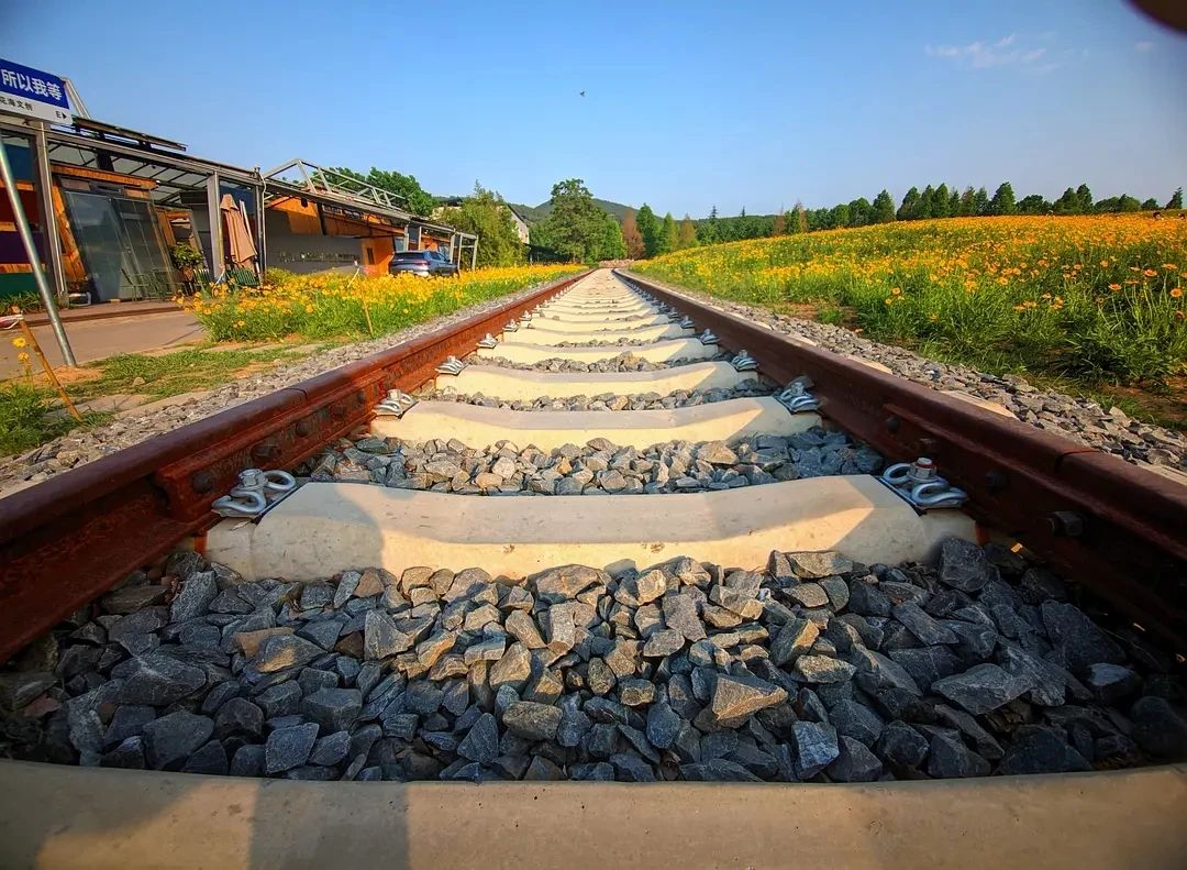 如何描述一条铁轨的延伸 周围是漫山遍野的小黄花?