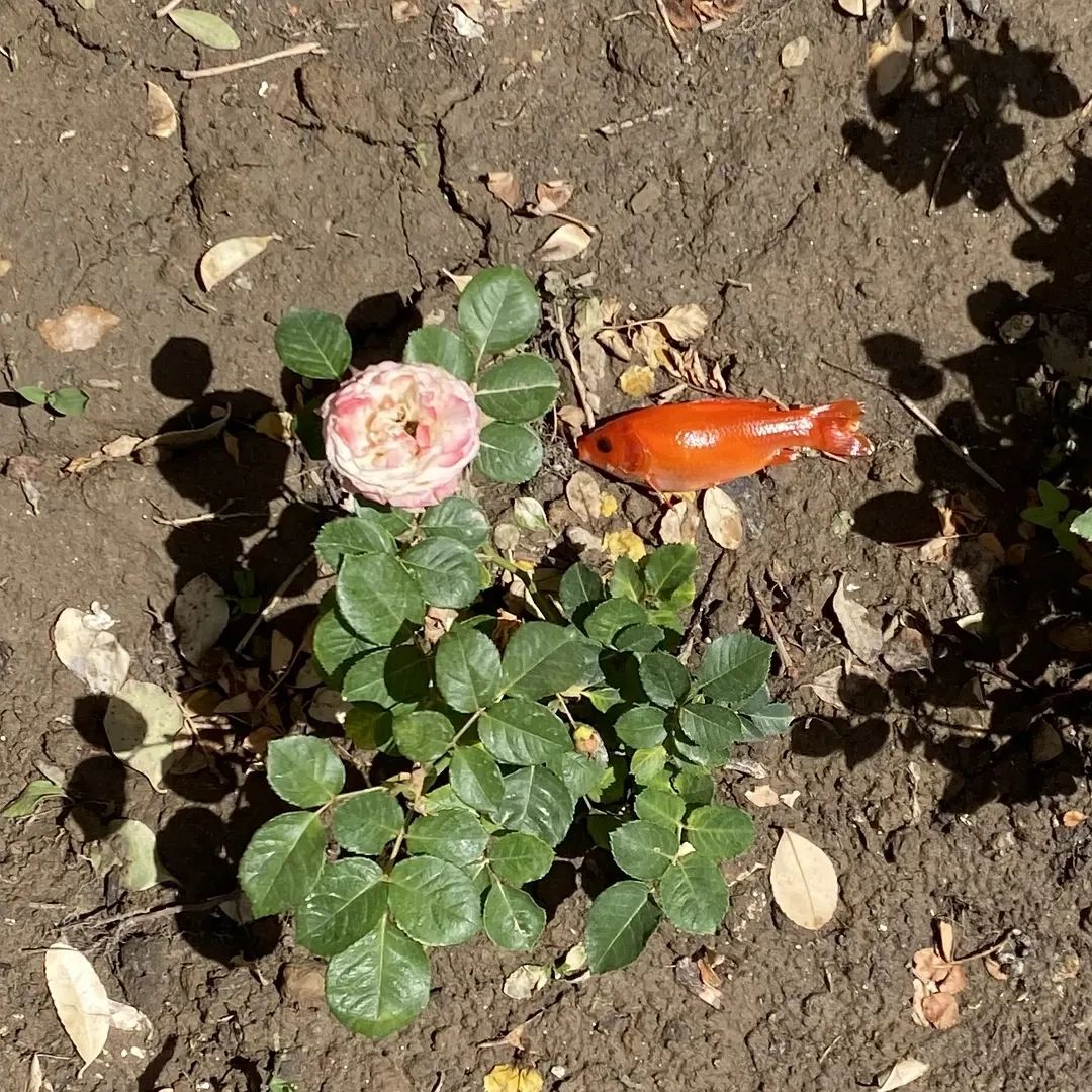 在花坛里看到一条已经死掉的小鱼然后拍下了这张照片,该怎么形容?