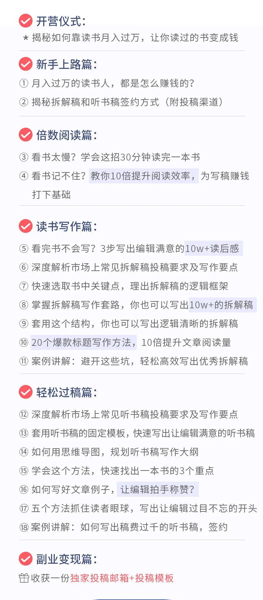我将自己的经验做成《18堂读书写作变现营·2小时开启过万副业》的课程,分别从拆解过程中的工具、三大阅读法、实战训练等模块展开。