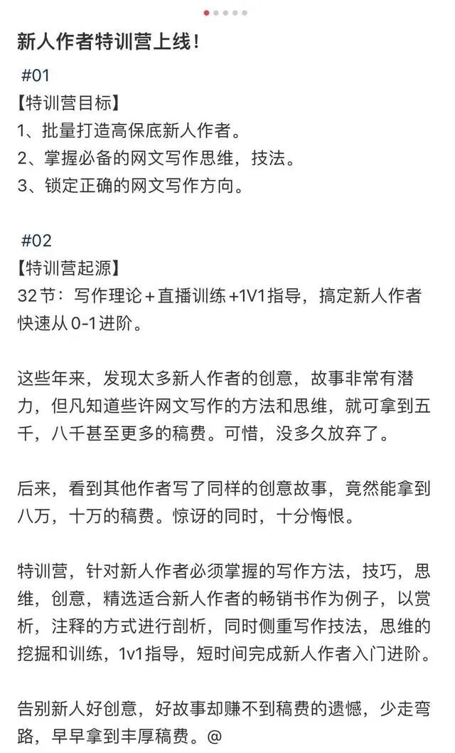 看不到网文前路的陈锦回头却看到大量涌进网文市场的新手,反复售卖的网文作者签约培训课,30元一节的售价反而比陈锦辛苦码字来得快速而实在。陈锦说,读者用4分钱在平台订阅1000字,作者得2分钱。日更1万字有100人付费订阅,单日稿费收入就是20元一个月30万字收入仅600元。