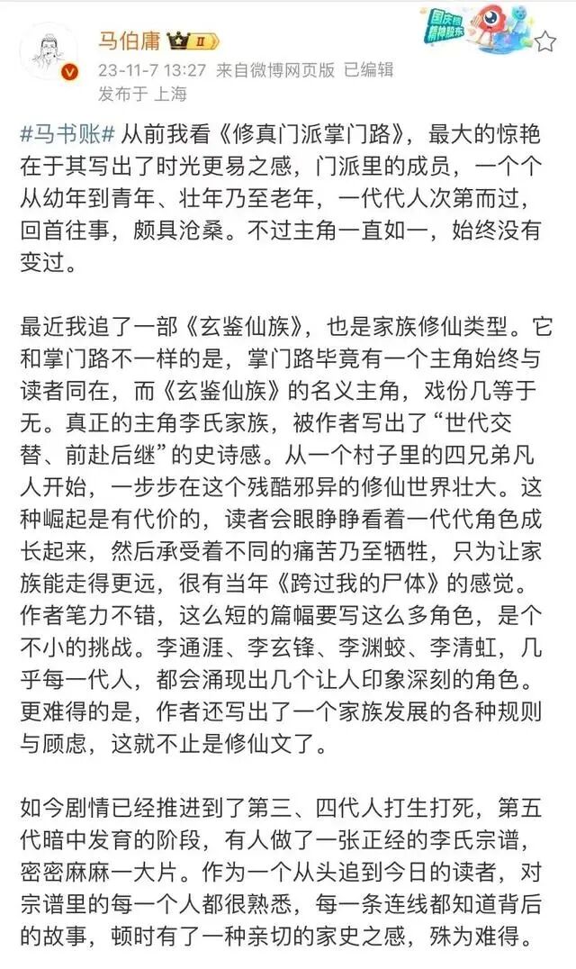 作家马伯庸也是《玄鉴仙族》的书粉,他曾于2023年在微博上推荐过这本小说,“作为一个从头追到今日的读者,对宗谱里的每一个人都很熟悉,每一条连线都知道背后的故事,顿时有了一种亲切的家史之感,殊为难得。”