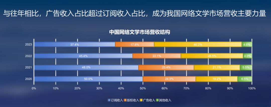 2023年,中国网络文学的市场营收结构发生了重大变化:广告收入占比超过了订阅收入占比,成为我国网络文学市场营收的主要力量。报告数据还显示,从2020年开始,广告收入的占比就一直追赶订阅收入,从当年的19.2%一直攀升到2023年的40.2%,超越了2023年订阅收入37.4%的占比。这也表明,网络文学市场近年来,从付费阅读到免费阅读、从文本阅读到IP衍生的整体商业模式发生了重大改变。不管市场是否认可,免费阅读的趋势都已不可逆。2023年的其他营收组成部分分别为版权收入17.8%,为近四年来最低,其他收入4.6%。随着IP衍生多元开发的深入,越来越多的内容生产机构倾向于自行开发优质IP;版权改编市场渐趋饱和,平台播放总量有限,都直接导致了版权收入的逐年降低。