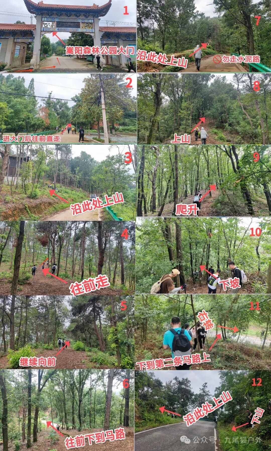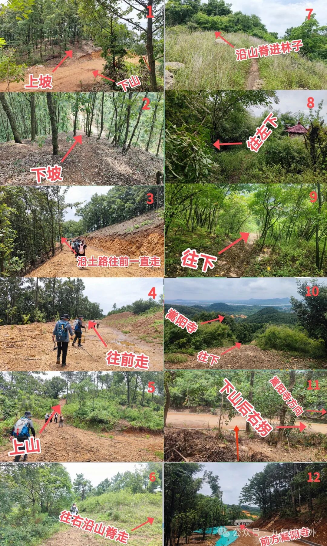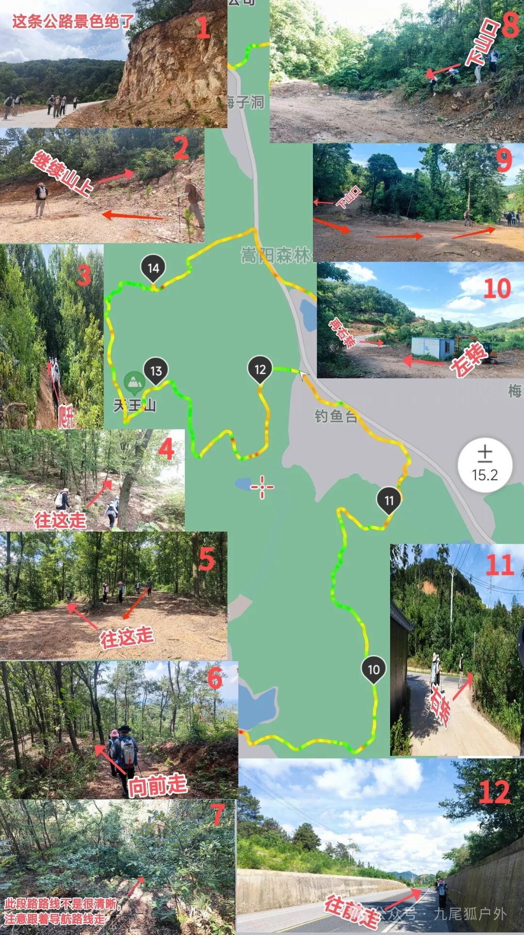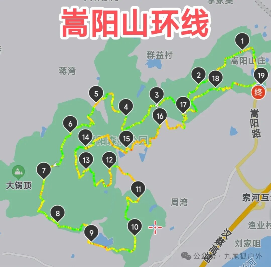 ☑️路线:嵩阳山庄→北兆山→化子山→嵩阳寺→钓鱼台→天王山→分金岭→北兆山→嵩阳林场☑️起点:蔡甸嵩阳林场⭐难度:整体难度不大,距离稍远,后半段公路较多。🍱补给:带两瓶水,中途嵩阳寺有小卖部(泡面饮料零食)。☑️路线详情:1️⃣起点至5km处:导航至嵩阳林场,从嵩阳森林公园大门进去免费停车,进大门后直走800m右转上山,一路上下坡,途经两段公路后上北兆山,北兆山下到第三段公路右转,经过眺望台往下到第四段公路,在公路对面左转上化子山。
