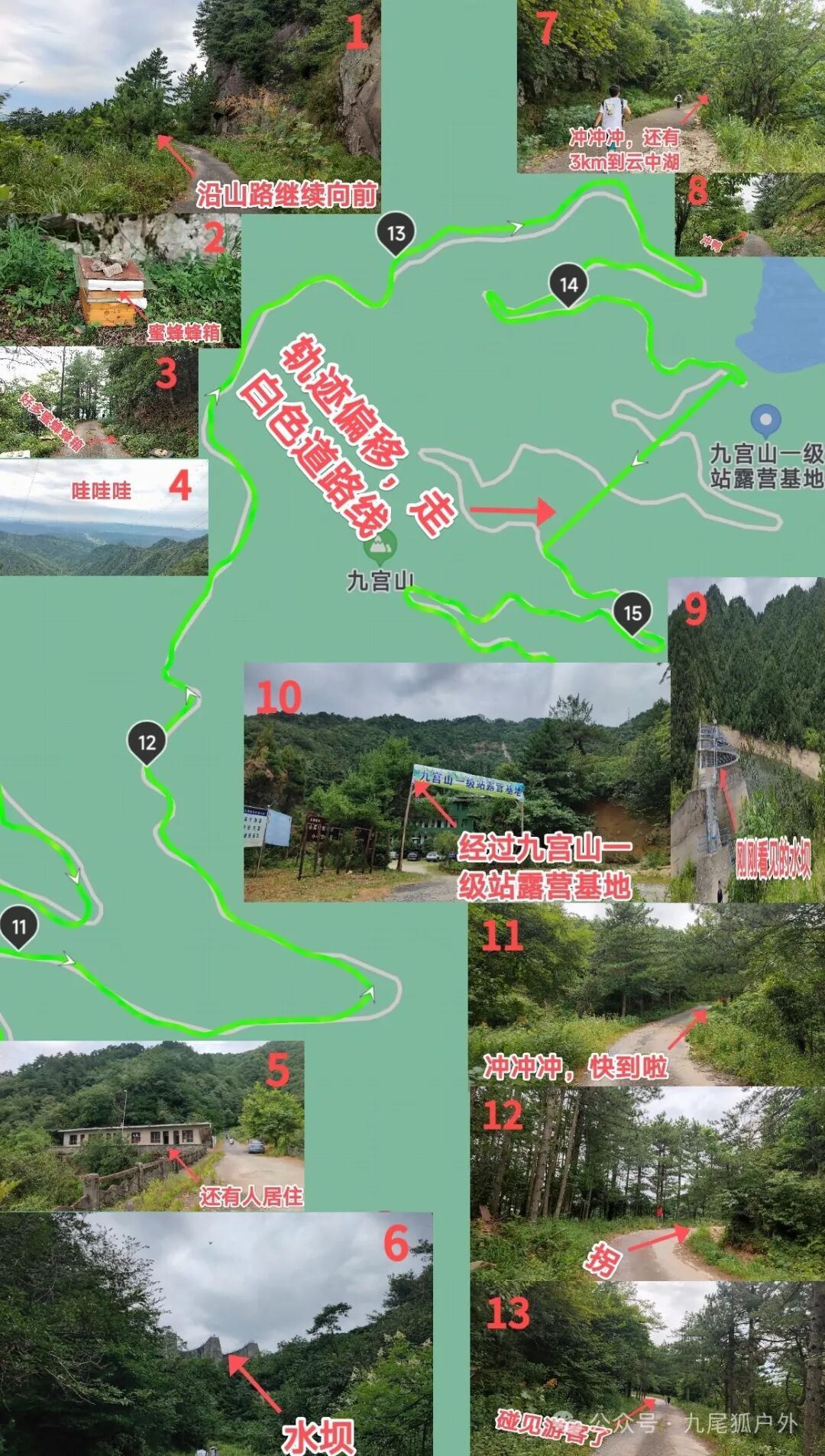 ⚠️避坑指南:1️⃣关于这条线路的起点,有说界碑的(没有定位),有说导航到石龙峡的。该线路上确实经过很多九宫山界碑,然后导航到石龙峡也有轨迹规划,但是我们只能开到细梅超市,也就是导航到石龙峡地图显示后面几公里道路变窄的起始位置。2️⃣该条路线目前有好几处塌方,汽车/摩托车/自行车均无法通行,只能徒步。3️⃣全程环山路而上,道路上有不少落石,注意远离崖壁防落石。4️⃣云中湖到铜鼓包有4-5km距离,有开车上山路线和景区楼梯路线。5️⃣山顶是不错的看日出、晚霞、落日、银河地,是否能看见视天气情况而定。6️⃣九宫山最高海拔1500m,温度低于山下8-10°,常年伴随有大风,是夏季避暑的好地方。