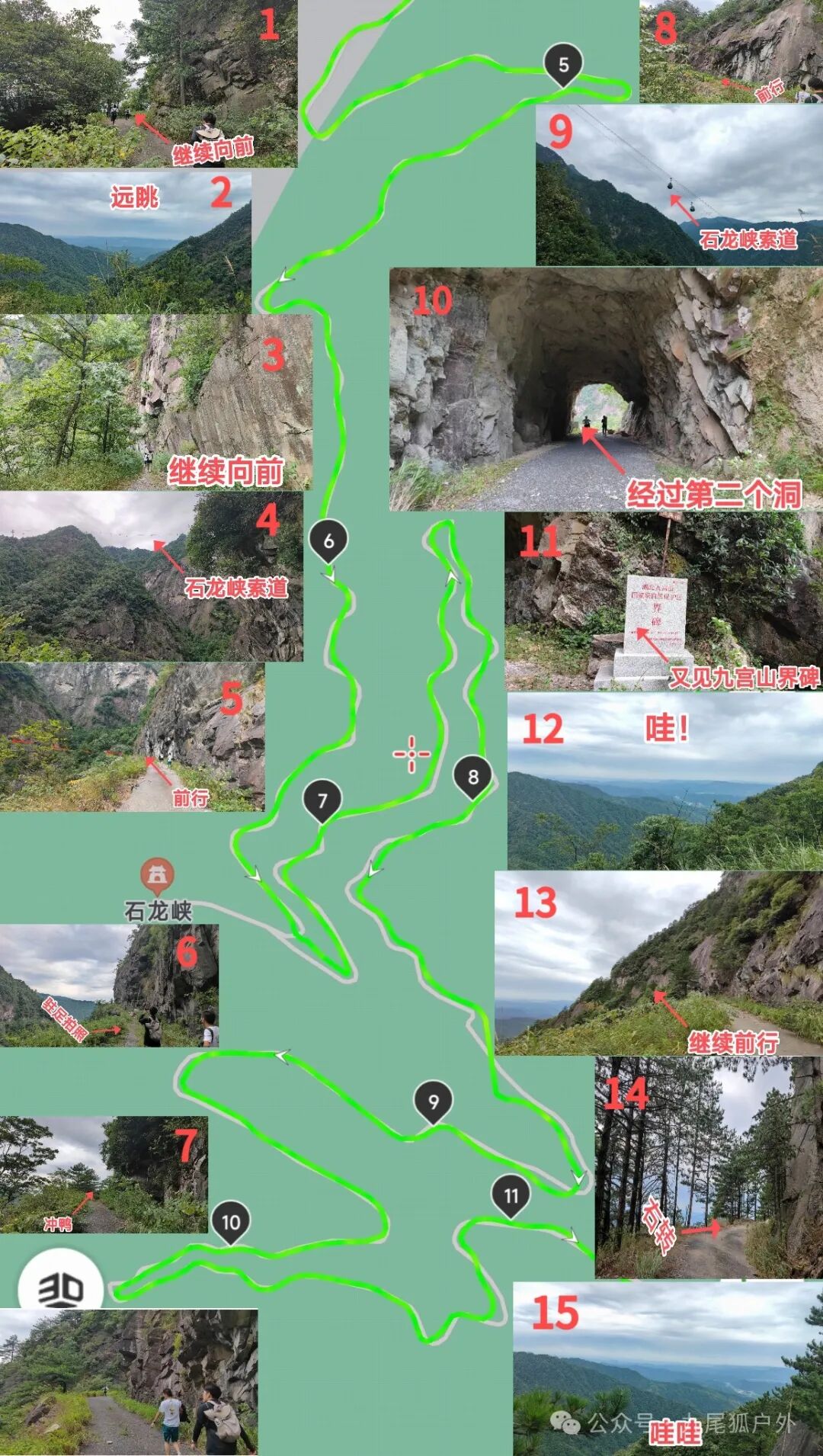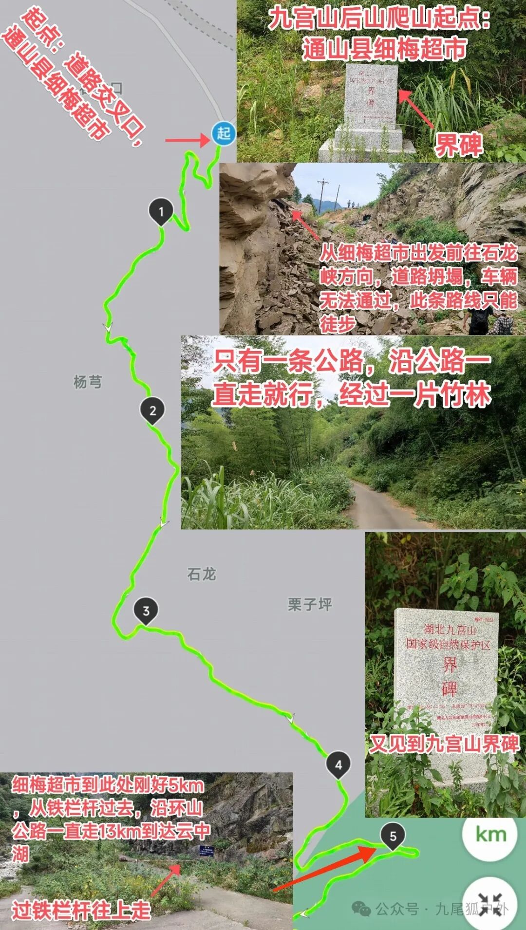 ✨【路线详情】1️⃣起点至5km处:从道路交叉口细梅超市出发,沿石龙峡方向前进,只有一条公路跟着走就行,会经过一处道路坍塌地,继续前行沿途经过几处界碑,路过一片竹林,在前进5km处岔路口往铁栏杆方向走(左边)。