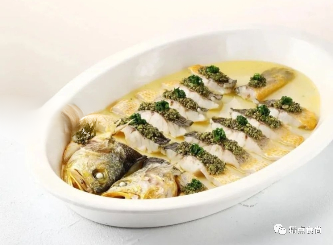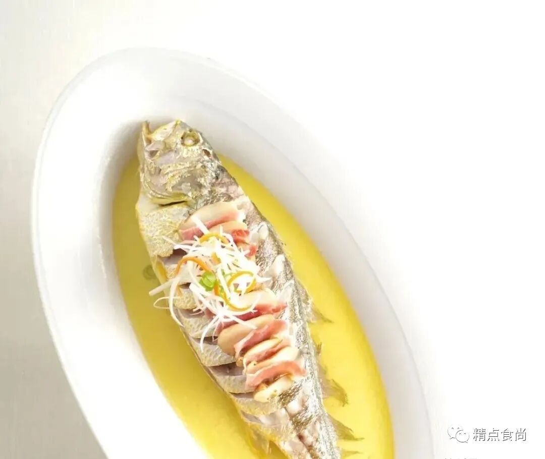 点评 比起干烧大黄鱼或者浓油赤酱的烹制方式,清蒸能把黄鱼最原始的鲜味淋漓尽致地呈现出来。此菜在淮扬菜的基础上,用了江南人自家的蒸鱼“秘方”,鱼肉鲜嫩,滋味醇厚鲜甜。