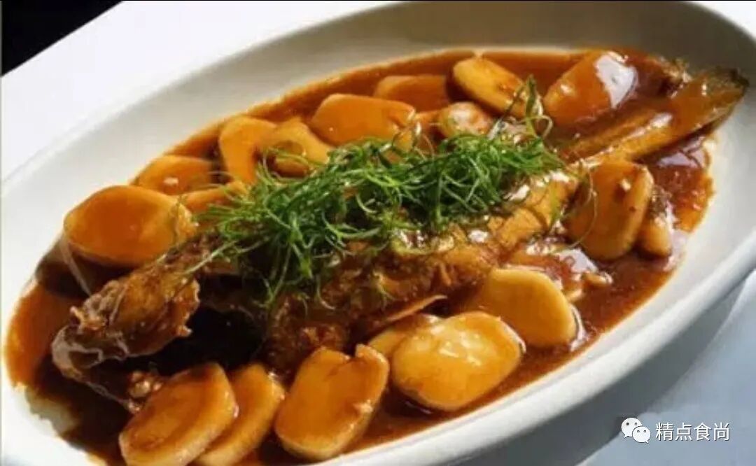 原料 鲜黄鱼1条(约650克~750克),花菇,金华火腿,蒲菜,秘制酱汁。