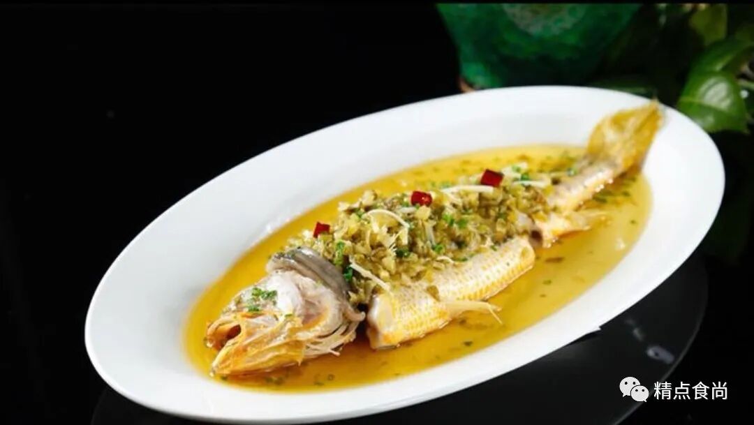 原料 宁波黄鱼1条(约750克),暴腌青雪菜,葱丝,姜丝,红椒丝,猪油,鸡汤,盐,白糖,胡椒粉,黄酒。
