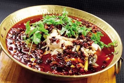 3、将烤好雨花石取出,放入铜锅内,把千页豆腐、杏鲍菇、豆芽、木耳垫底,上面摆好鱼片,然后迅速倒入烧好的麻辣汤汁,再倒入麻辣油,撒上香菜即成。