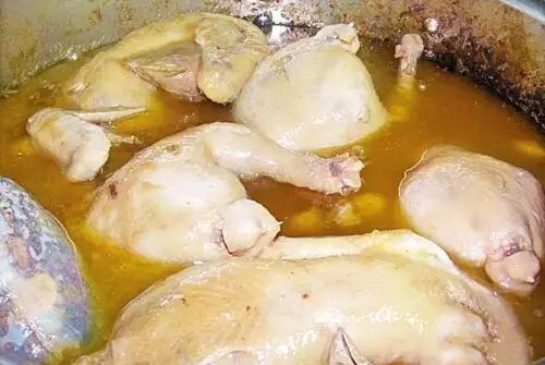 2、三黄鸡宰杀治净,氽水,再下入卤汤中卤制。