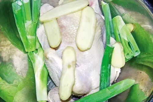 重约750克的优质三黄鸡一只,葱、姜各10克。