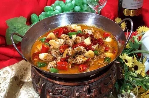 山药片100克,酸菜20克,小花螺300克,蒜头、青、红椒节各10克。