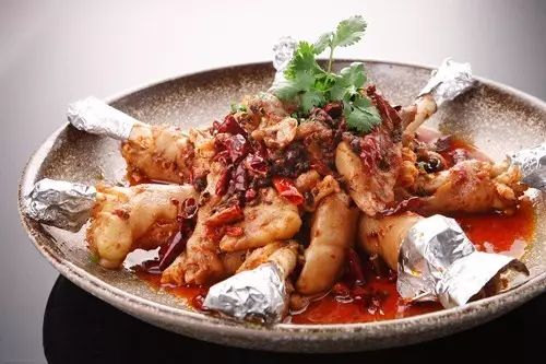 3、锅入红油50克,烧至七成热时,放入干辣椒10克小火炒香,出锅浇在羊蹄上,撒上香菜叶点缀即可。