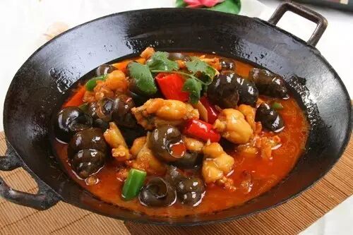 田螺500克,鸡翅根300克,泡姜米50克,蒜末50克,青红椒节、香菜叶各少许。