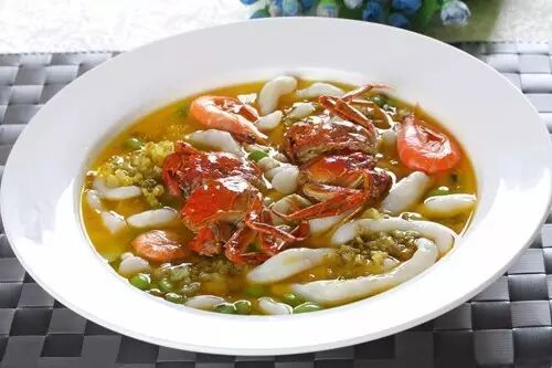 3、锅入底油烧至四成热,下姜葱蒜末爆香,下入酸菜小火煸炒出香,然后下入高汤、毛蟹及面疙瘩,加盐、鸡精调味,大火烧开后改小火烧5—7分钟,再下入毛豆米、基围虾稍煮,勾薄欠出锅即成。