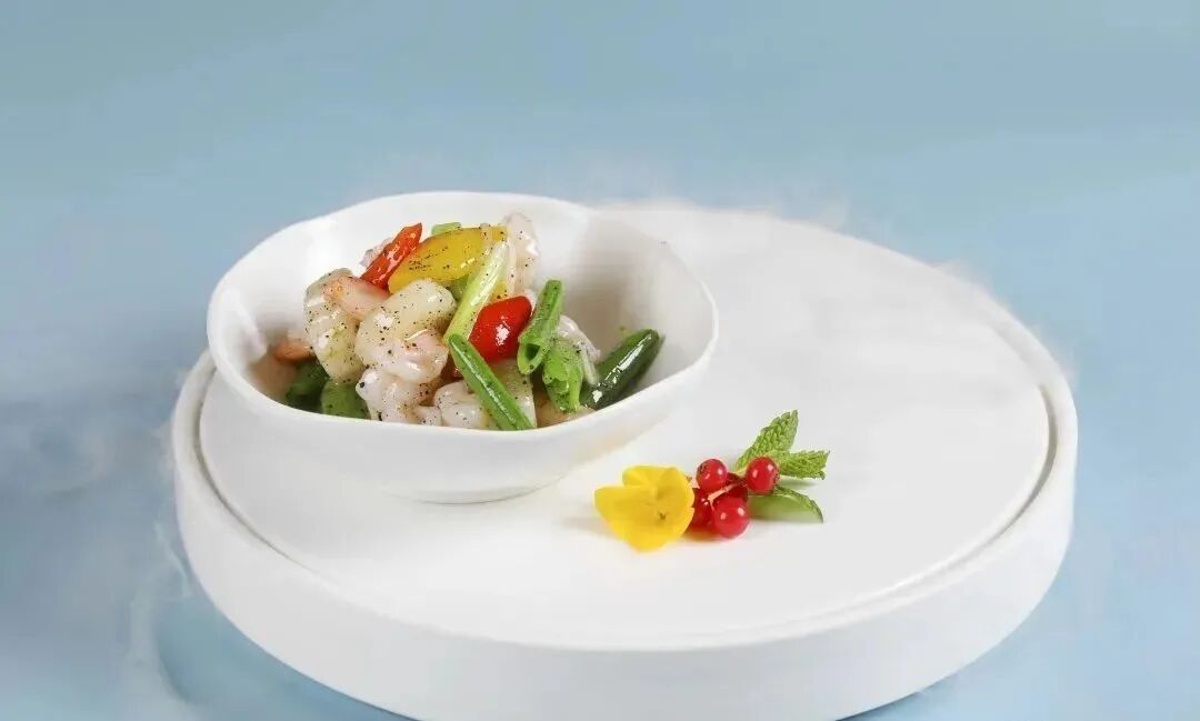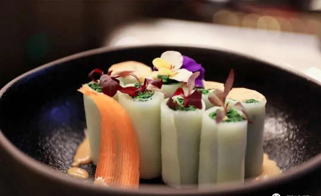 2. 红小米椒和野山椒切成圈,纳盆后掺入500 毫升矿泉水,放入姜、葱、盐、味精、白醋、糖,调成酸辣汁,放入花菜梗浸泡,放冰箱冷藏8 小时后取出装盘,白萝卜片铺在其上,稍加装饰即可。