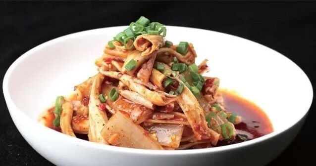 原料:(月君)把100克、厚皮菜100克、蒜泥5克、鸡精3克、东古一品鲜酱油5毫升、白糖5克、醋5毫升、花椒面2克、蚝油2克、花椒油3毫升、炒熟的豆瓣酱10克、红油5毫升、葱花适量