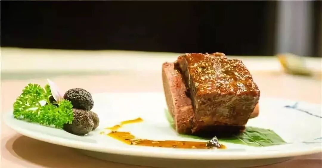 2、把清水、盐、糖、烧汁和切碎的黑松露一起煲开后,放下牛肋排煮90分钟即可,装盘后用原汁勾琉璃芡,淋在表面即可。