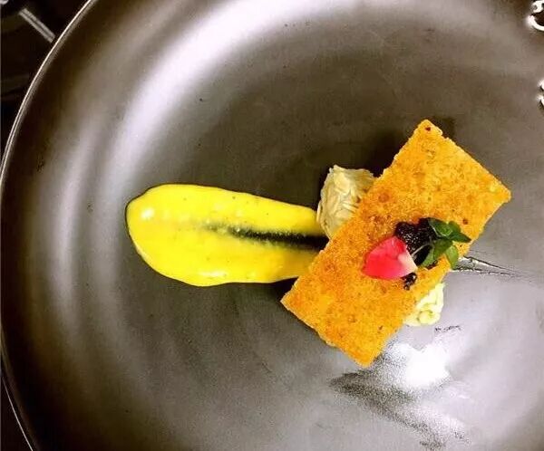2、黄芥末划碟,燕麦泥挖成榄状放于中间,置上烧腩皮,点缀黑松露酱和食用鲜花即可。