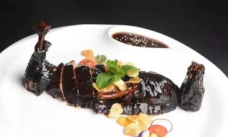 3.调制鸭酱。往锅里倒叉烧酱和海鲜酱,加入少许的卤水,大火收浓成酱汁,盛出一部分撒上熟芝麻作为蘸碟,一部分用来均匀涂抹在卤熟的鸭子上。最后把鸭子斩块,装盘后点缀,即可。