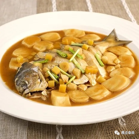 3. 锅加入葱油放入姜片、拍蒜炒香,加入笋片、鱼汤、调料、鮰鱼块焖至入味软糯,撒入煎好的葱白粒;