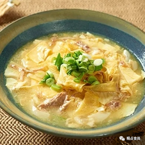 3. 锅入猪油炝香蒜片,下削骨肉翻炒片刻入二汤,鸡汁煮开,下豆皮和剩余小料,调味料小火煨至入味即可。