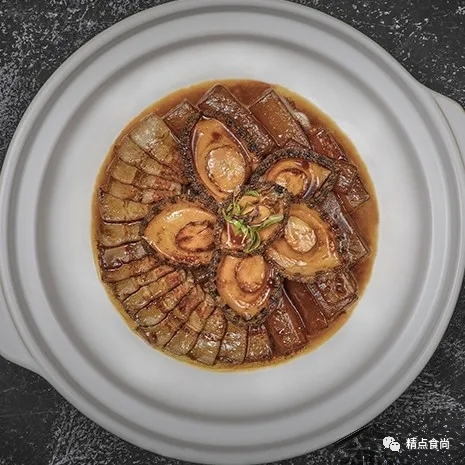 3. 锅烧热加入猪油20克,放生姜,八角,五花肉煸炒出油,放冰糖,老黄瓜,老抽煸炒上色、加入剩余调味料和鲍鱼大火烧开、中火入味、小火收汁时放入松露酱、淋葱油15克即可装盘、葱丝点缀。