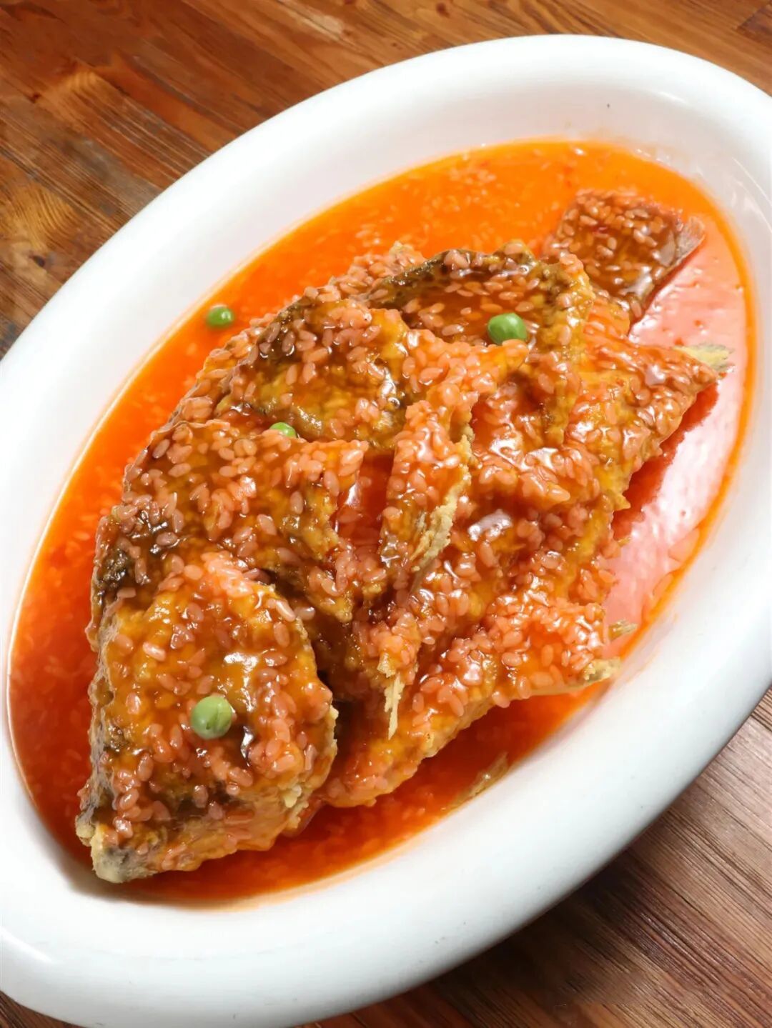 锅入宽油烧至六成热,拎起鱼尾垂直悬于锅上,不断将热油浇在鱼身上,使花刀处的鱼肉绽开,定型后将鱼放入油锅内,中火炸5分钟至熟,转大火炸1分钟至其表面酥脆,捞出摆盘,浇甜酒汁100克,在鱼眼处点缀一颗煮熟的豌豆即可走菜。