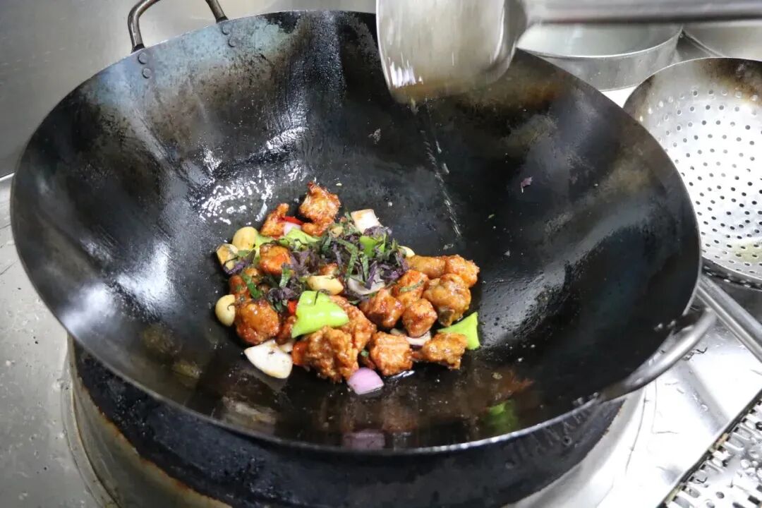 此菜选用广西本地的红心番薯搭配炸排骨,成菜显得分量十足。而原本两种炸货搭配带来的些许油腻感,也被咸甜酱汁很好地中和,呈现出粉糯甘甜与焦香酥脆的味觉碰撞,诱人食欲。