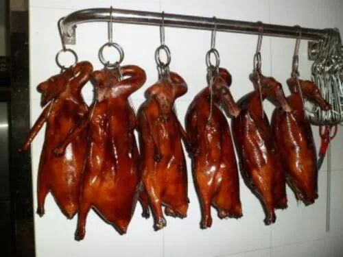 鹅种的选择说到烧鹅,那我们得先从鹅开始说起。鹅不同于天鹅,鹅,被认为是人类驯化的第一种家禽,它来自于野生的鸿雁或灰雁。中国家鹅来自于鸿雁,欧洲家鹅则来自灰雁。家鹅,它是鹅类中的素食主义者,根本不会吃荤食,不要以为鹅长期生活在水里就会吃鱼虾等,而且长得比鸭子肥壮。其实它们只吃水生植物,藻类等,包括人为投放的饲料或青菜,最爱吃的是稻谷。烧鹅,鹅种就有讲究。譬如平头鹅、狮头鹅因为本身肉质较粗糙,适合长时间焖煮,只能用来做卤水;而烧鹅则要用清远黑鬃鹅。黑鬃鹅一般七八斤重,皮下脂肪肥瘦适中。这样烧出来的鹅,肉质嫩滑又有鹅香。其次,季节也有讲究。一年之中,最适宜吃鹅的是春秋两季:春季是指清明前后的两个月,秋季是指重阳前后的两个月。