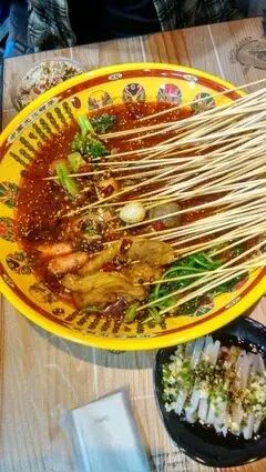 4、将烫熟的荤素串串放入事先调好的底汤中即可。