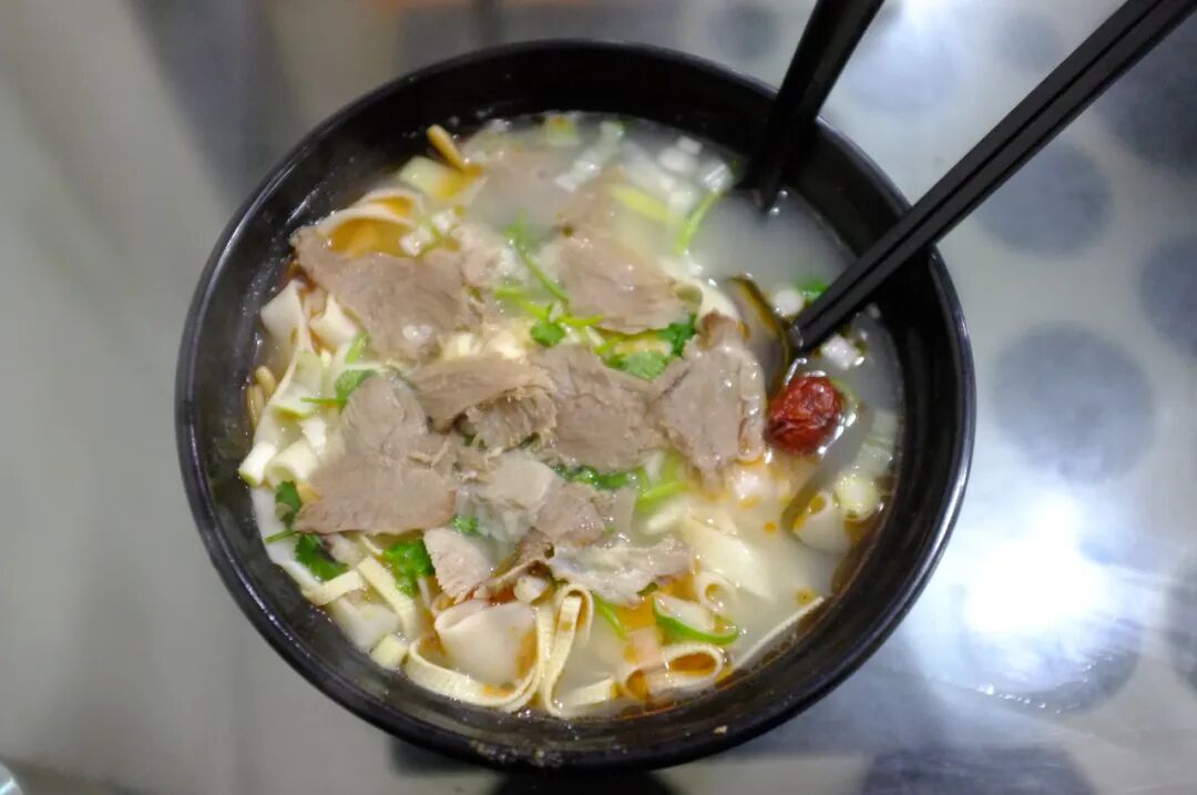 2.煮制:净锅内加滤净骨渣的羊肉汤,大火烧沸后撇去浮沫,下入200克面片煮至七成熟,再下海带丝、木耳各6克、豆腐皮、粉条各8克、菜心15克,煮熟后捞起,盛入碗内,浇上汤汁,上面放羊肉片15克、枸杞3粒,即可上桌。