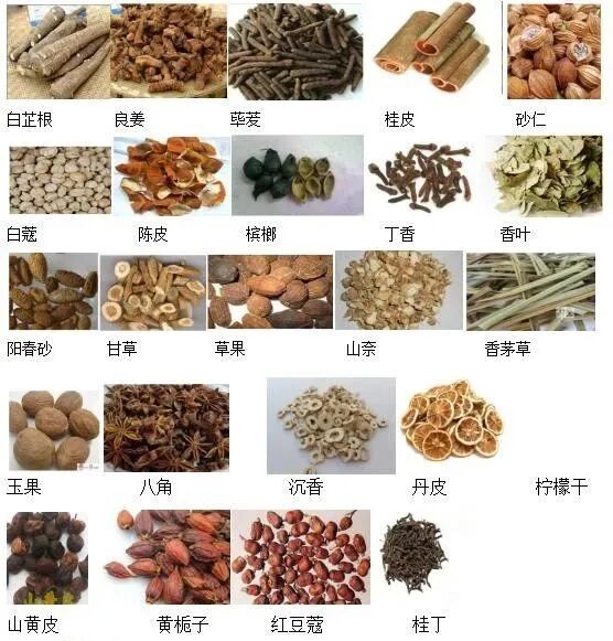 沉香8克,丹皮7克,柠檬干5片,山黄皮7克,白芷根40克,桂皮20克,陈皮12克,香叶9克,草果16克,玉果15克,良姜15克,砂仁20克,槟榔25克,阳春砂20克,山奈8克,八角30克,荜拨8克 ,丁香15克 ,白蔻10克,甘草30克,香茅草10克,黄栀子3个,红豆蔻8克,桂丁7克,广木香5克,党参12克。