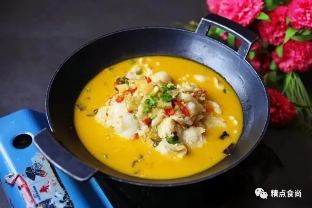 4.锅入500克筒子骨汤、300克鱼酱烧开,倒入吊锅中,撒上葱花,跟酒精炉上菜即可。