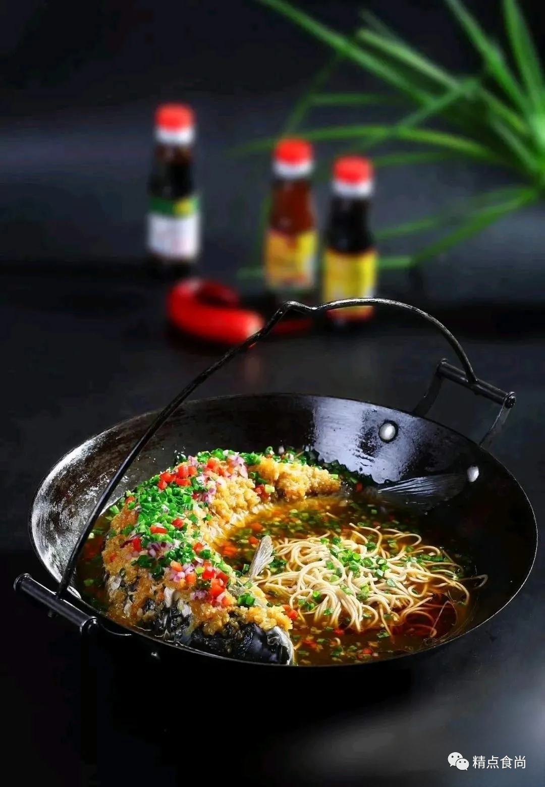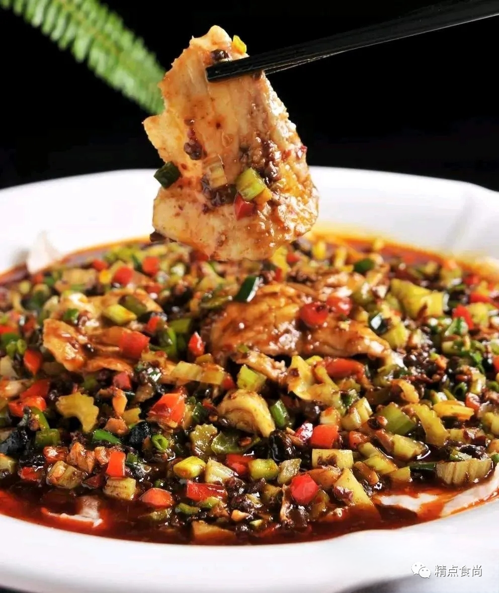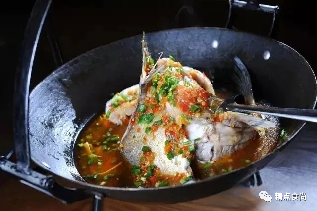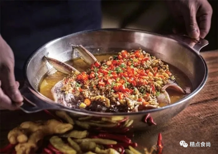 3. 锅入菜籽油,炼熟后加入猪油、鸡油,下入盐菜粒、姜粒、蒜粒、泡小米椒末、泡野山椒末、鲜小米椒末、干青花椒、干红花椒,炒香后掺适量鲜汤,加入味精、鸡精,起锅舀在铺有鱼头的锅仔里,上桌点火堂烹15分钟,即可开盖食用。