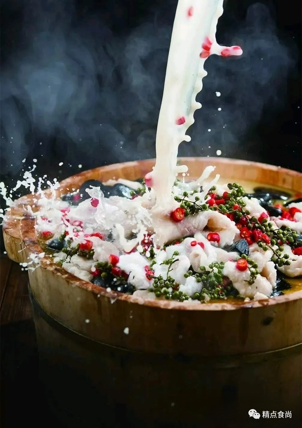 3.出菜时,把炸好的雨花石(200℃)装在木桶里,另把木桶鱼汁水烧开,加入藤椒油、香油和小米辣圈装在水瓢里,与加工好的鱼片一起上桌,然后当着客人的面,把鱼片倒在垫有热烫雨花石的木桶里,再把水瓢里的汤汁分三次淋入木桶里 (此时汤汁沸翻),盖上盖焖一分钟即成。