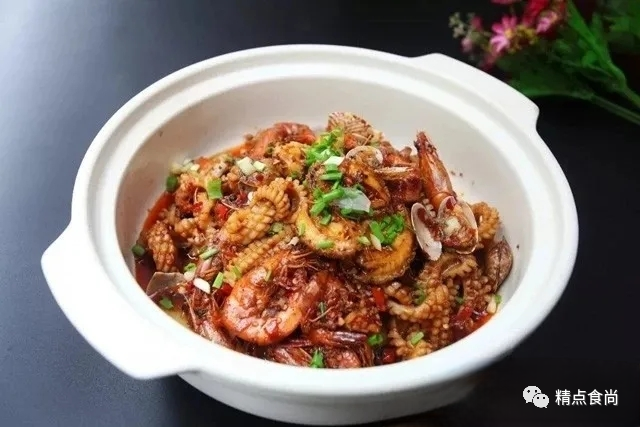 3.锅留底油,放入蒜米、姜米、辣妹子、豆瓣酱、花椒炒香,再放入辣椒面、海鲜酱炒匀,下入花甲和已过油的海鲜翻炒,加入啤酒、味精、鸡精、蚝油、蒸鱼豉油, 生抽炒匀,装入烧热的砂锅内上菜即可。