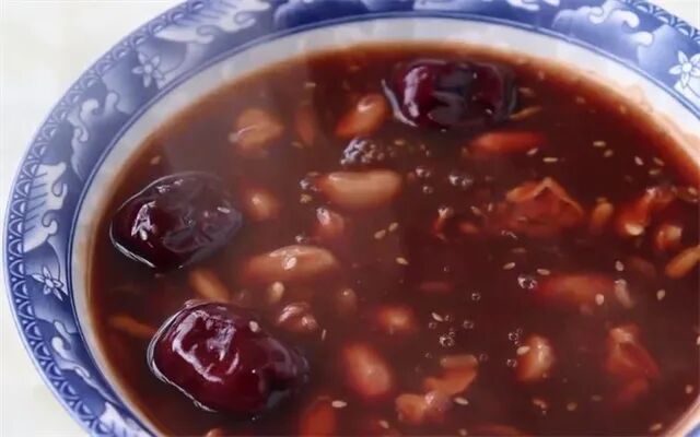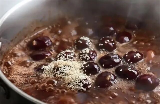 5.大约40分钟后,豆子煮得熟而不烂,红豆汤就兢好了,颜色特别的红,然后加入刚才蒸熟的糯米和红枣,锅里汤再次煮开后加入瓜子仁和葡萄干,然后根据自己的口味加入适量的白糖,最后加入水淀粉搅匀,加入白芝麻就可以出锅了